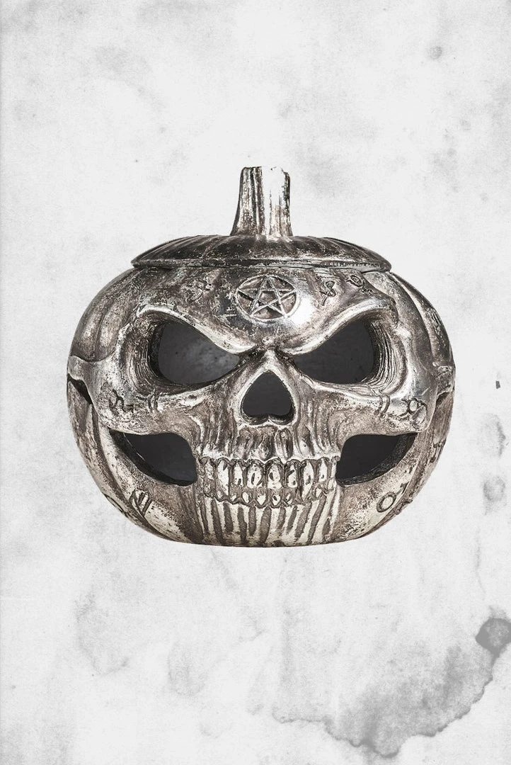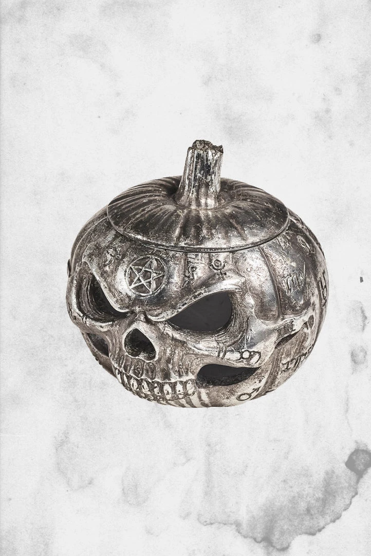 Stash away your favorite items in this Halloween themed pumpkin skull pot or just sit in on your shelf as your favorite decoration.