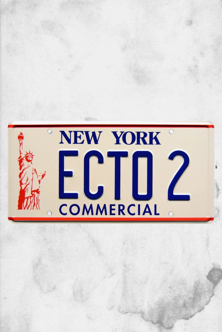 The white New York ECTO 2 License Plate is produced as seen on the ’59 Cadillac Ambulance very briefly in the 1989 movie Ghostbusters 2. Ecto-1a was originally scripted as Ecto-2, and only one reference remains in the movie. When Dr. Venkman is standing outside of his apartment and the car pulls up, the phrase ‘ECTO 2’ is visible on the license plate. We are happy to produce this plate because we know it will end up in the hands of the world’s biggest Ghostbusters enthusiasts who will appreciate its uniqueness!