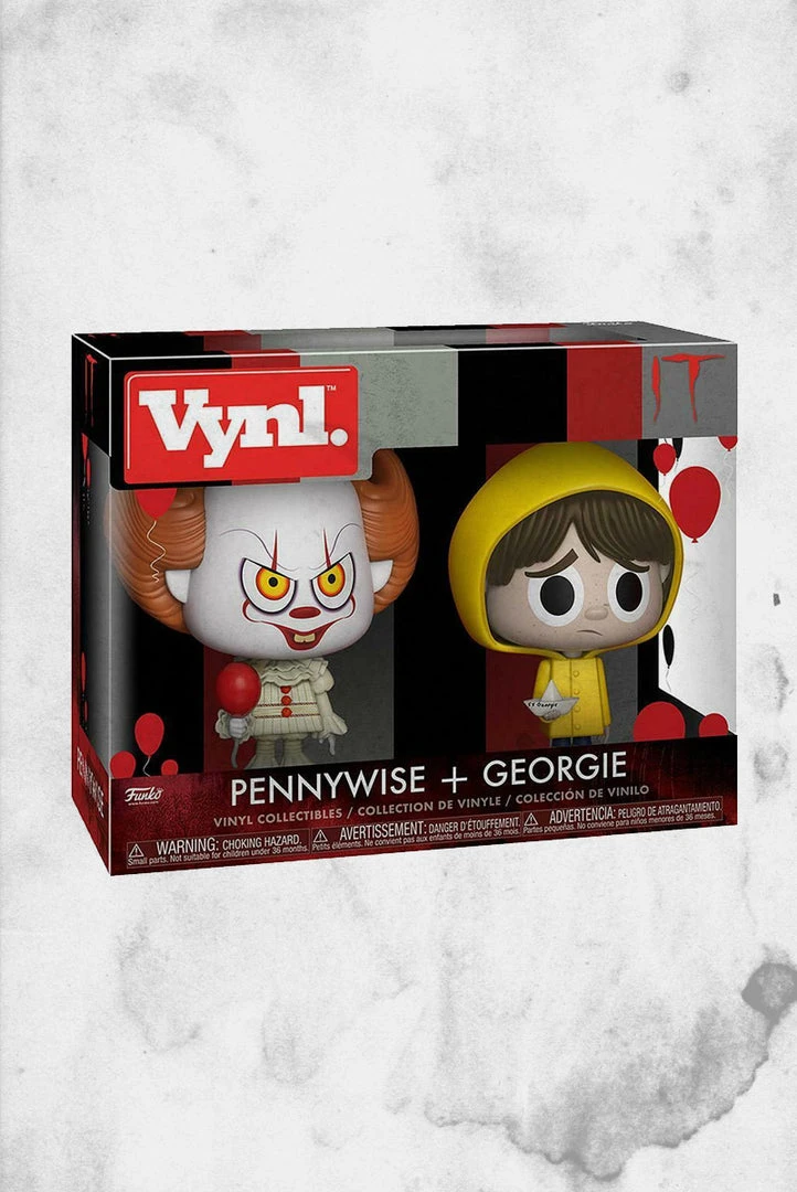 Will Pennywise convince Georgie to float? This vinyl pair features Pennywise holding his enticing red balloon, and Georgie — complete with his raincoat and holding his paper boat, the S.S. Georgie. Each figure measure approximately 3 3/4 inches tall, are made of vinyl and come in display-ready collector packaging.