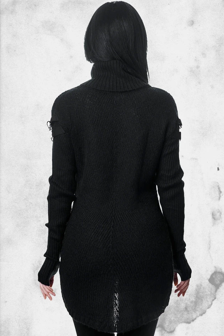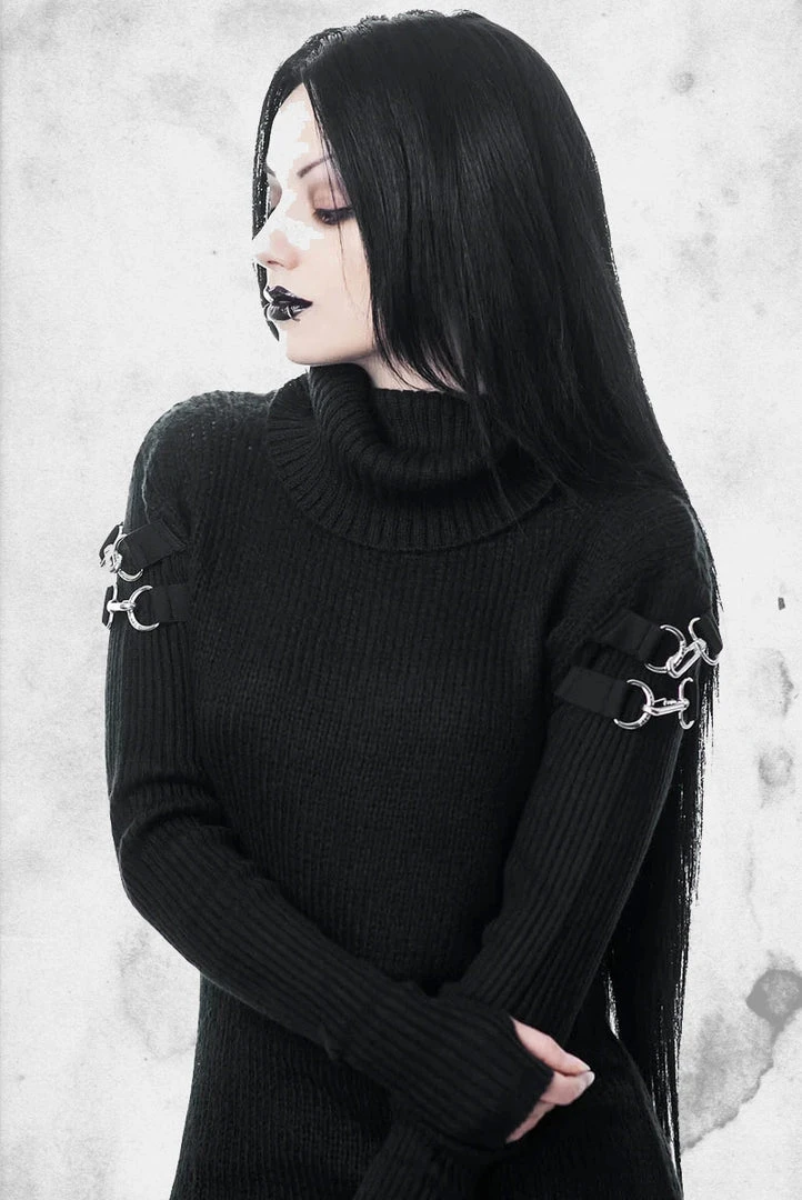 Winter is comin’ and be ready to welcome the darkness with the ‘Assimilate’ soft knit sweater. Featuring a soft knit structure with a high folded-neck, fitted long sleeves and extra-long body; perfect for layering. Adorned with contrasting D-ring and hardware. Dress it up or down with ease!