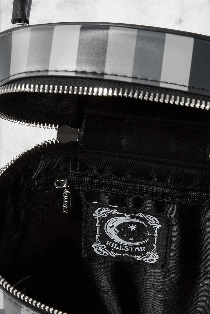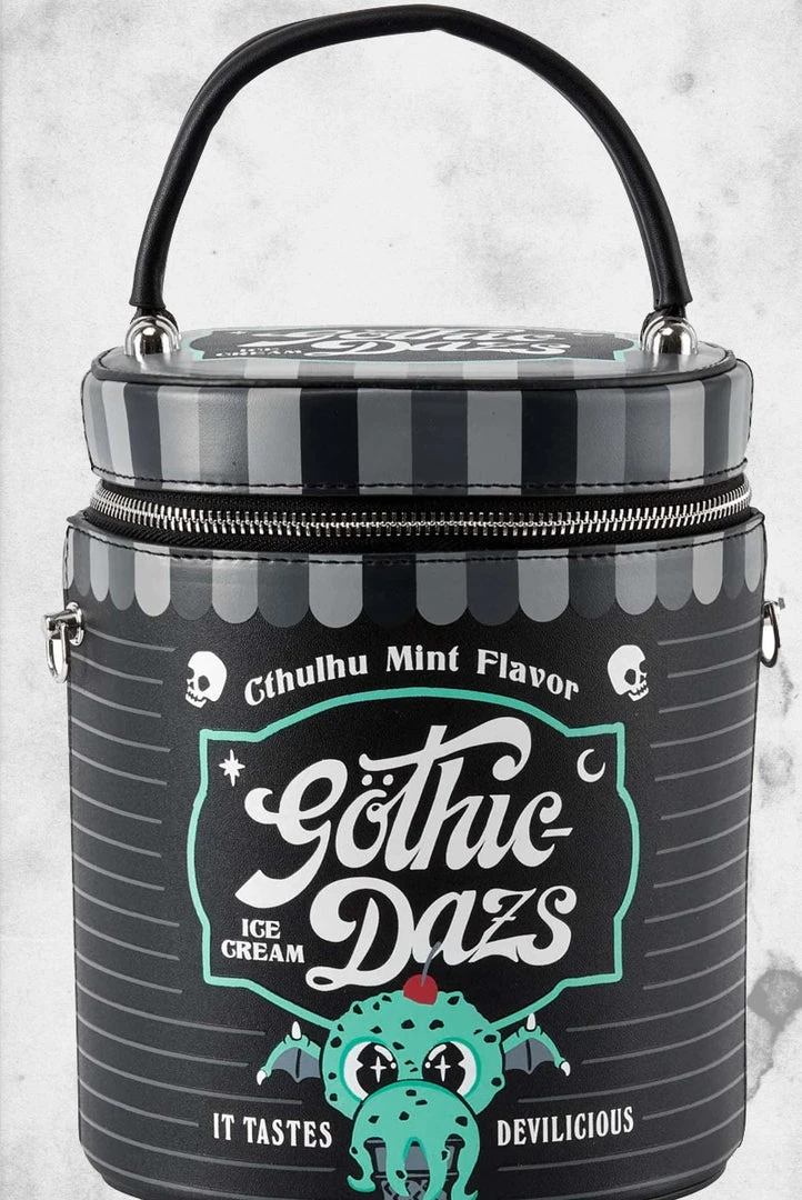 Cute and playful bucket bag – ‘Gothic Dazs’ comes in a rounded shape and printed motif to front. With zip closure – fits all yer essentials, perfect for nights out, shoots or just hanging with yer coven!