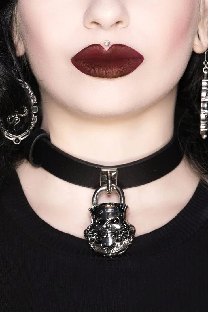 Hold yer head up high and step up yer choker game with the ‘Lock Me Up’ choker; a silver finish with a statement skull charm. Fully adjustable for the perfect fit. Be ready to make heads roll! Adds instant drama to your look!
