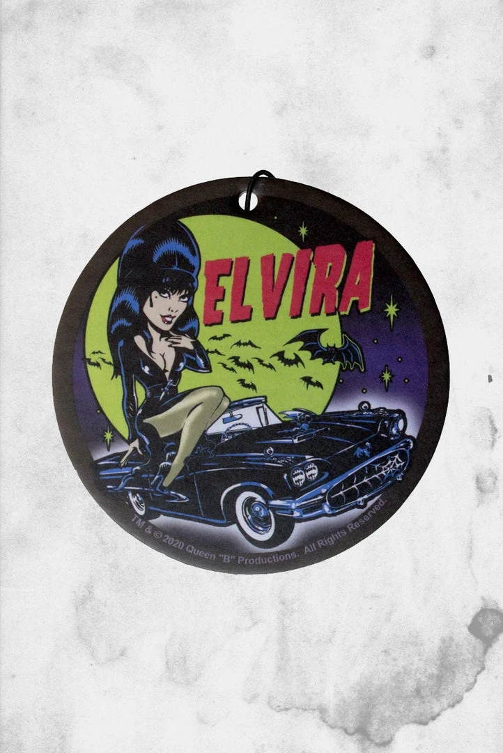 This beautiful full color 3.25″ round air freshener of your favorite spooky queen Elvira, comes with an elastic band to make it easy to attach to any place you want to smell clean and fresh.