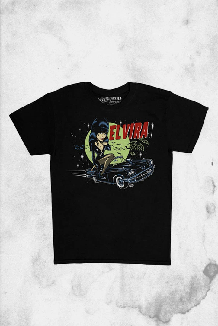 Official licensed Elvira Mistress of the Dark macabre mobile mens tee by Kreepsville, super soft discharge print with exclusive design by Vince Ray.