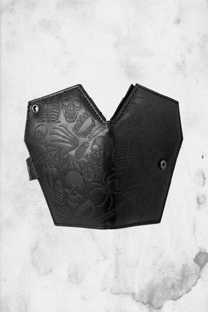 Embossed coffin wallet, embossed with images of skull, spiders, and other creepy crawlers, with snap fastener, ID, cards, and note sections with eyelet for a wallet chain.
