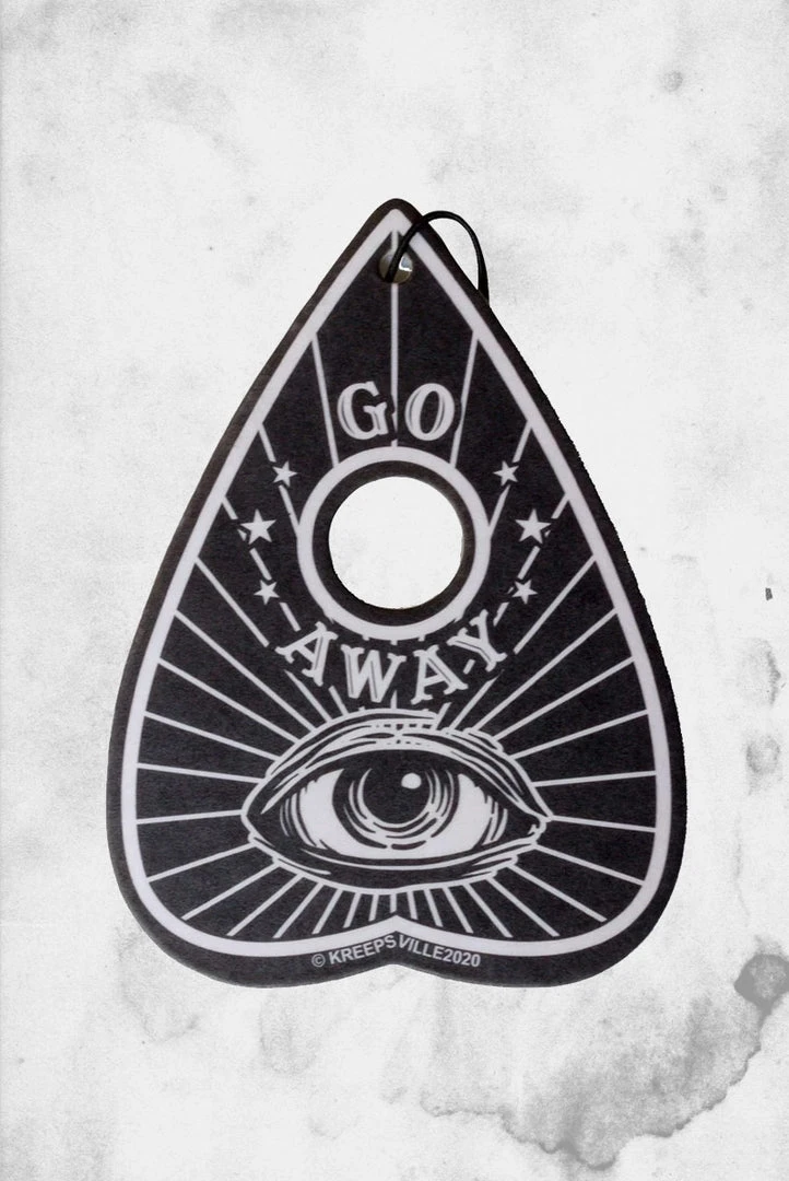 This beautiful full color 3.75″ x 2.75″ tall air freshener of your favorite spooky item – a planchette, comes with an elastic band to make it easy to attach to any place you want to smell clean and fresh.
