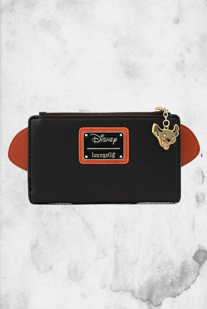 The Lion King Scar Cosplay Flap Wallet is made of vegan leather (polyurethane). Wallet snaps closed, has a zipper pocket, and features: hyena enamel zipper charm, printed, debossed, and applique details. Take note of the coordinating design of the inside lining fabric.