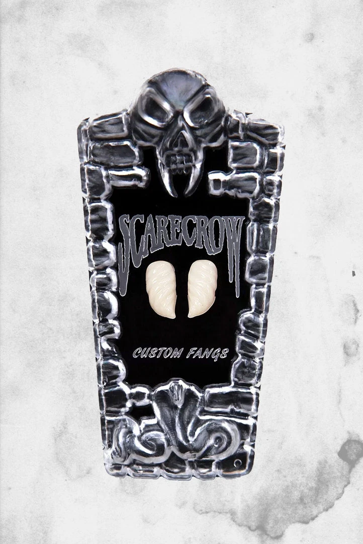 Sabers Extra Long Deluxe Custom Scarecrow Fangs are 1 inch long from gumline to tip and are designed for an extreme look. They may fit either canines and/or incisors. Fast, easy, comfortable, and totally realistic. Natural color fang caps are shiny, rigid and beautifully contoured to look great in any mouth.