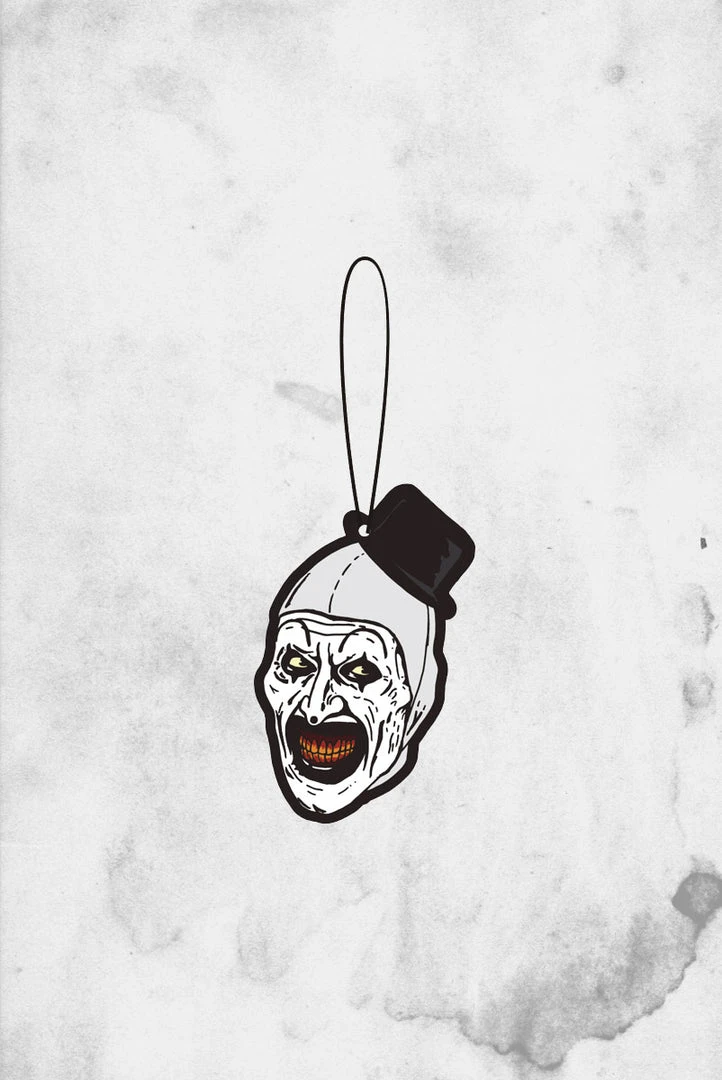 This beautiful full color 3.5″ tall air freshener of Art the Clown from the movie Terrifier, comes with an elastic band to make it easy to attach to any place you want to smell clean and fresh.