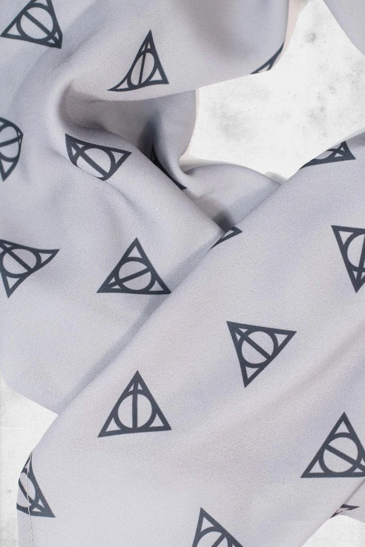 Show off your new charms with this delightful hair scarf from Unique Vintage in a charming collaboration with Harry Potter! Crafted in a silky chiffon, this vintage pin-up accessory features the iconic Deathly Hallows symbol printed throughout a grey backdrop. A fabulous accessory for tying up and around your divine ‘do – any excuse for a little sky-high hair help!